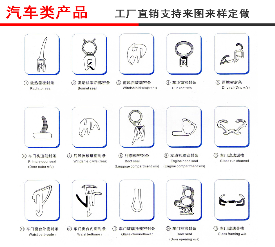 常用天候密封條有門框密封條、行李箱密封條、發動機箱蓋條等。常用一般密封條有前后風窗密封條和角窗密封條、內外側條等。